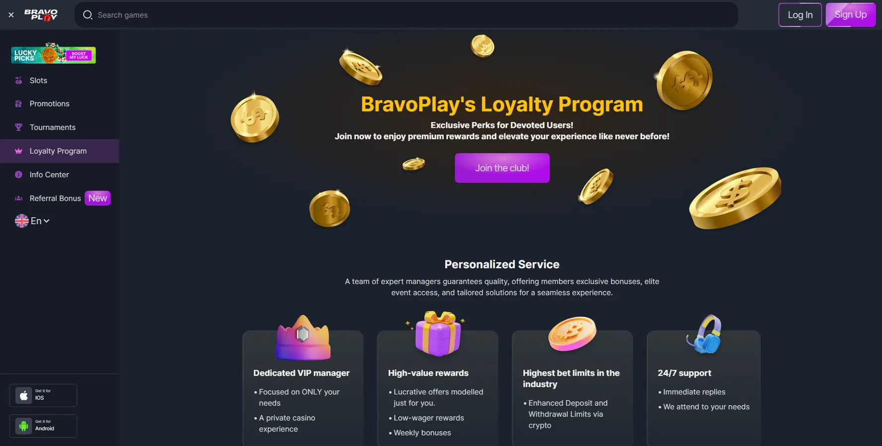 Bravoplay has a 7-tier VIP program, rewarding loyal players with exclusive bonuses and privileges. Entry requires a deposit of $500, after which players earn points for real money wagers and progress through tiers.