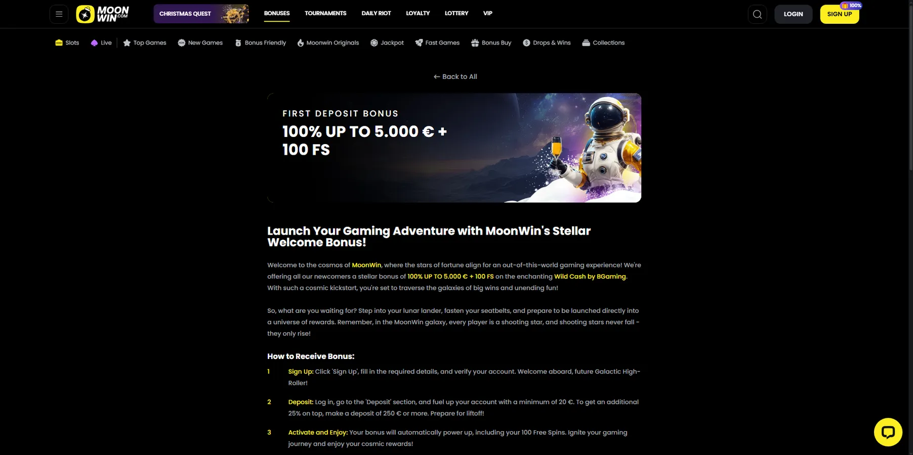 On your first deposit of €20 or more, Moonwin Casino offers a 100% match bonus up to €5,000, plus 100 Free Spins for Wild Cash. Players depositing €250 or more unlock an enhanced 125% High Roller bonus. The wagering requirement is 40x on the deposit and bonus combined, and it must be completed within 5 days.