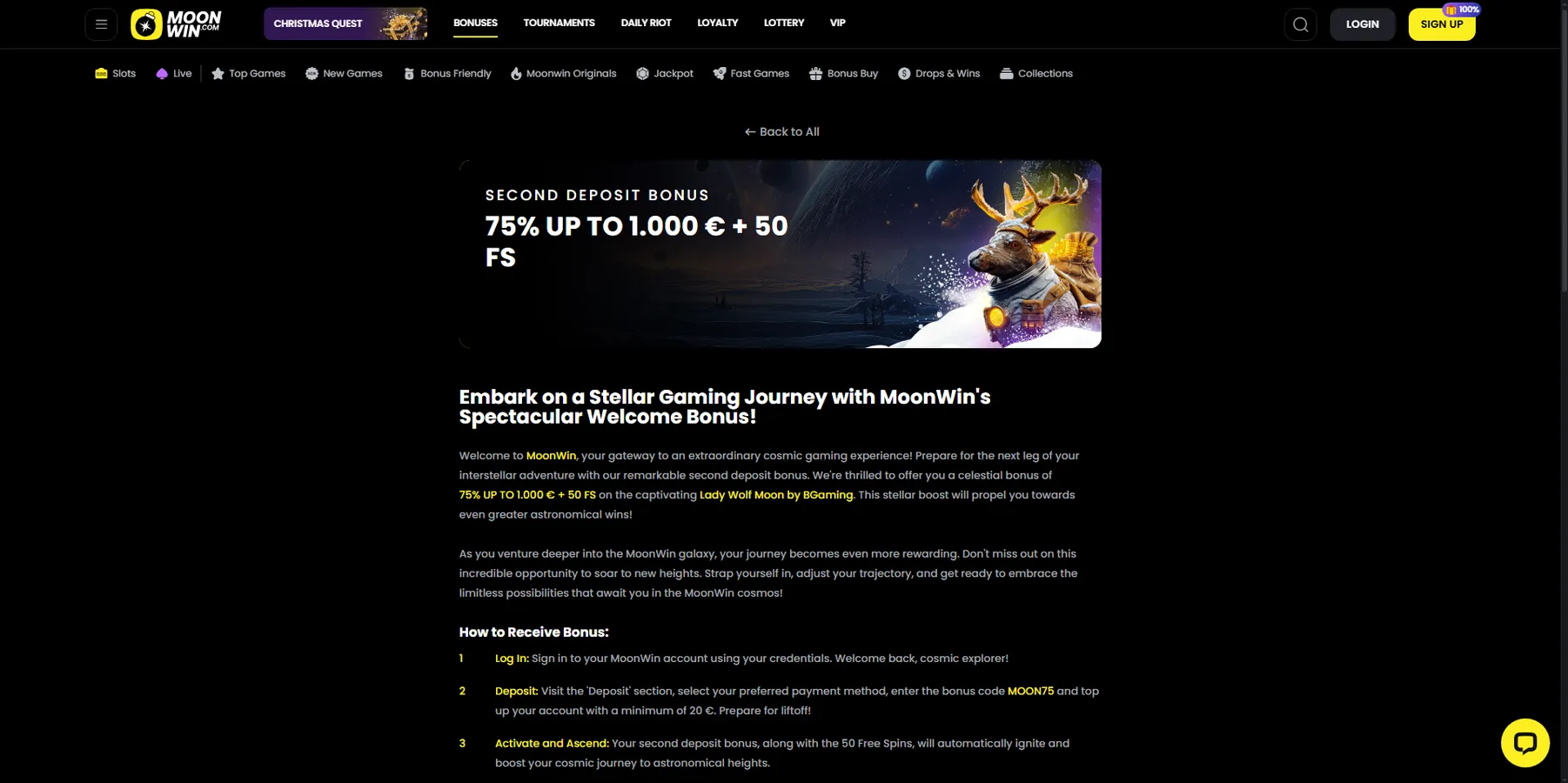 For your second deposit, add at least €20 and use promo code MOON75. You’ll receive a 75% bonus up to €1,500, along with 50 Free Spins for Lady Wolf Moon. The wagering terms remain 40x within 5 days.