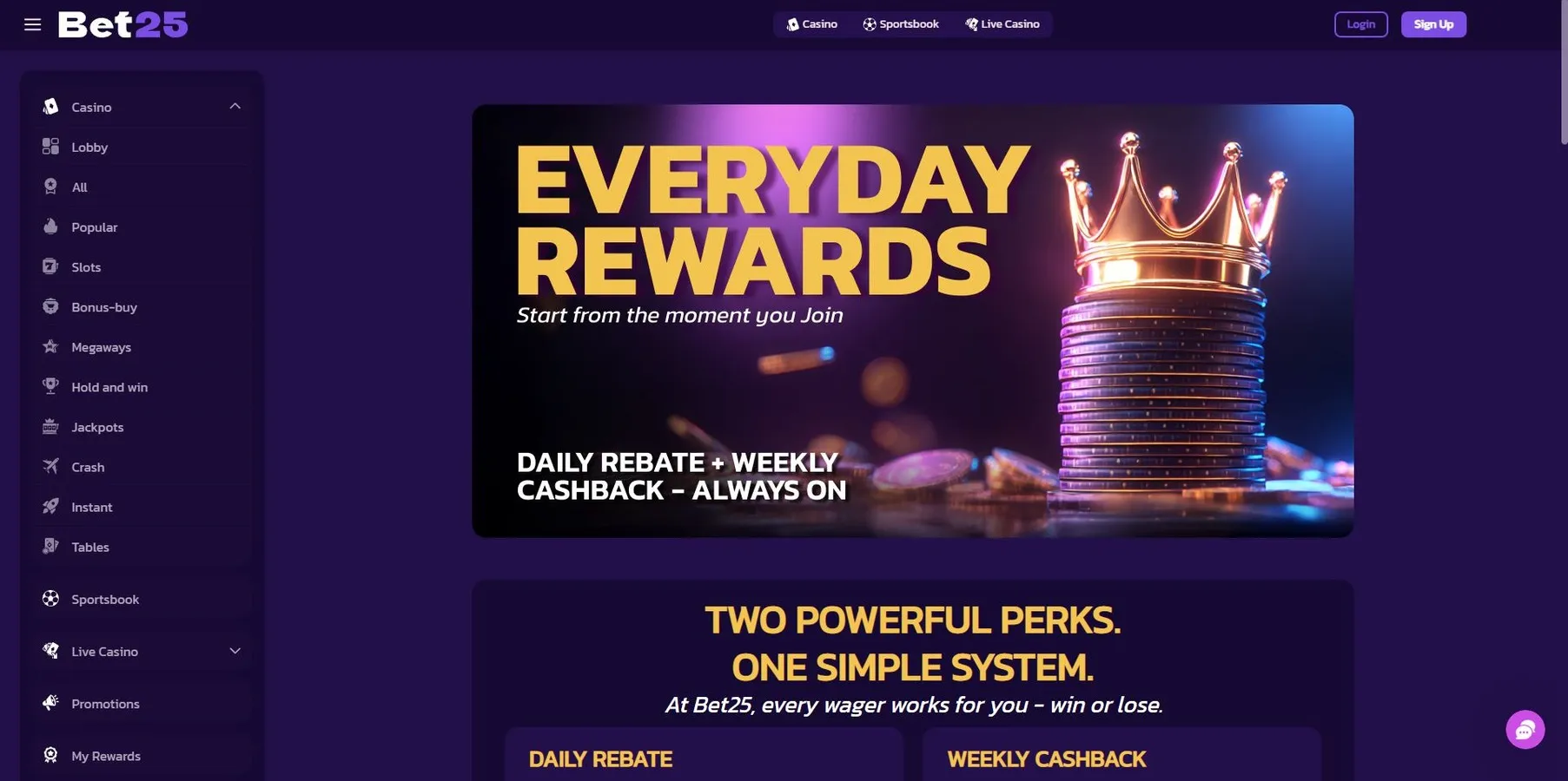 No momento, o Bet25 Casino não oferece nenhuma aposta grátis nem promoção de bônus sem depósito. A estratégia da plataforma prioriza recompensas significativas vinculadas à atividade real do jogador, em vez de artifícios promocionais iniciais com termos restritivos.