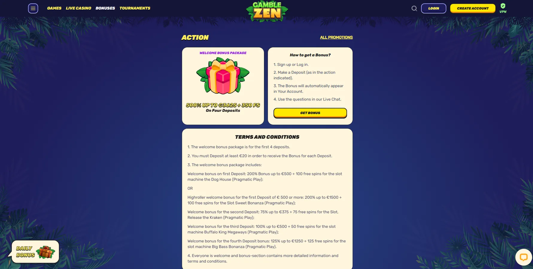 Embora não haja oferta sem depósito, a Gamblezen compensa com um excelente pacote de boas-vindas de quatro níveis: